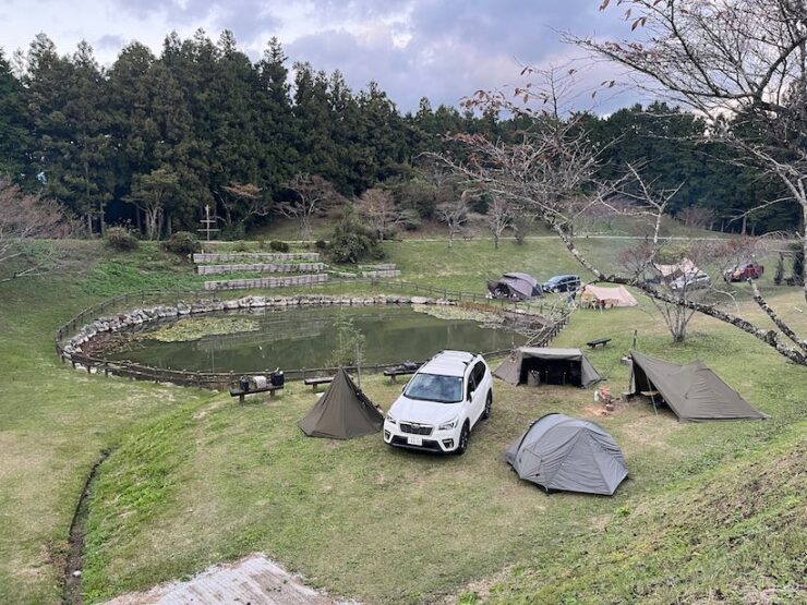 池はそんなにキレイでも無いし、斜めの場所が多いので少し離れた東屋の近くに張りました。
