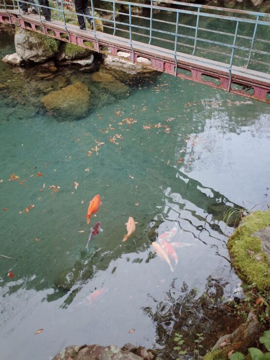 道路から少し降りた所からだと赤い橋が見え、下まで降りると青い橋が架かってるという、